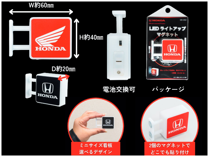 | 特徴: | HondaのHマークとWingマークのLEDライトアップマグネット。 Honda公式ライセンス商品だけにリアルなHondaのロゴミデザイン。 コレクションにも最適。工具やホワイトボードなど金属面にぴったり貼り付きます。 実用的かつインテリアにも。 |
